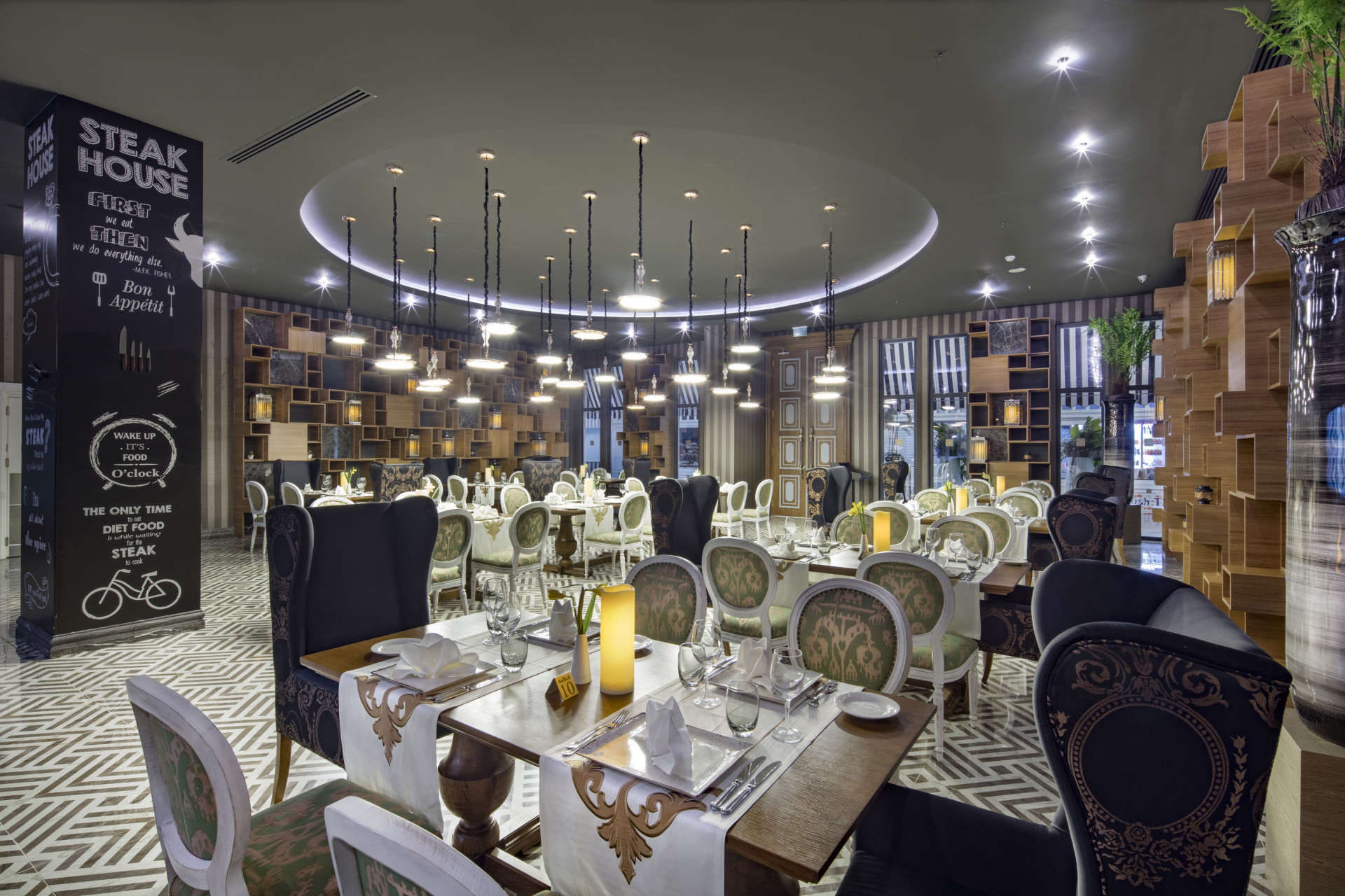 - 4 à-la-carterestaurants Restaurant met internationale specialiteiten (vooraf reserveren) tegen bijbetaling, Steakhouse (vooraf reserveren) tegen bijbetaling, Turks restaurant (vooraf reserveren) tegen bijbetaling, Visrestaurant (vooraf reserveren) tegen bijbetaling